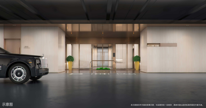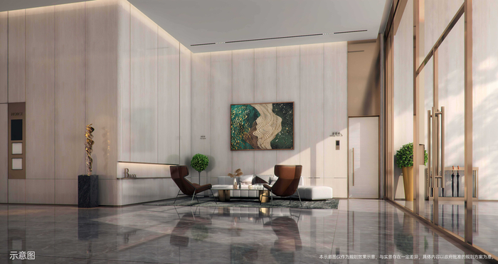 单元入户大堂整体风格与外立面浑然一体,沿用质感夹丝玻璃和金属线条的高规格材质,采用星级酒店玻璃大堂设计。