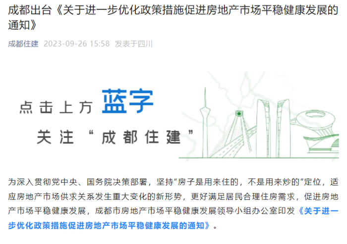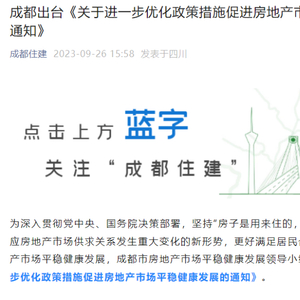 9月26日,“成都住建”公众号发布《关于进一步优化政策措施促进房地产市场平稳健康发展的通知》。