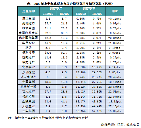 面对低迷行情,为加快去化回款,补充流动性,提高经营效率,推进精细化管理以及创新营销策略、加大营销力度仍是房企工作的两大抓手。2023年上半年,楼市复苏不及预期,市场和企业表现相对平淡,销售负增长房企仍不在少数。在此背景下,整体销管费用规模同比下降近9.5%,其中近六成典型上市房企销管费用同比下降。