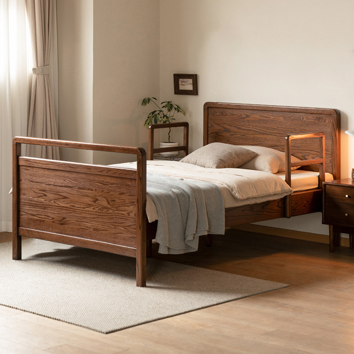 源氏木语深入研究了老年人的身体机能衰退问题,特别针对视力弱化、易磕碰、反应变慢、易摔跤、骨骼老化以及易腰酸背痛等老年人常见的痛点,进行了人性化设计。他们推出了一款适合老年人的床,床头部分采用创新的加高设计,提供了实木和软靠两种选择,有效地支撑肩部和背部,让老年人在床上倚靠更加舒适,有效缓解肩背部疲劳。床的两侧设有可调节的实木扶手,不仅防止老年人跌落,还方便他们轻松起身。床尾部分采用加高镂空设计,方便老年人在床边走动,同时也为他们的起夜提供了便利。