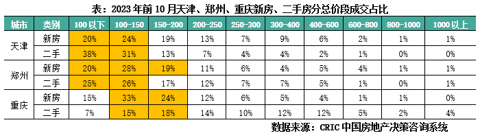 1、成交结构:津郑成交主力总价段150万以下,重庆100-200万受青睐
