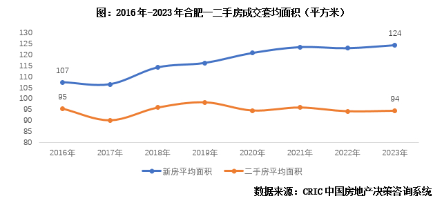 三是新房产品“越做越大”,二手房总价更友好,倒逼刚需买二手房。比如合肥,2016到2023年间,新房成交套均面积由107平方米增长至124平方米,而二手房套均面积几乎保持在95平方米左右不变。
