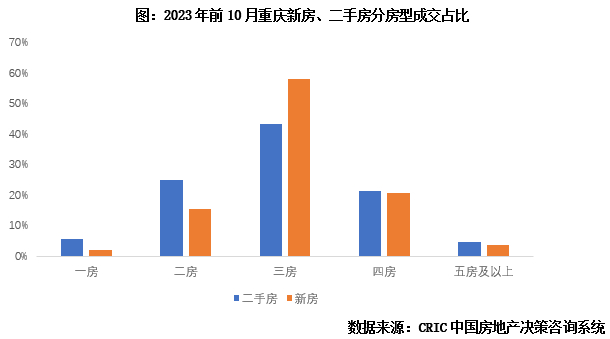 再比如从房型维度来看,以重庆为例,三房无论在一二手房市场都最为畅销,成交占比都在50%左右。三房产品兼顾功能性和总价,已经成为新房,2023年成交达到58%,同比增长4个百分点,也越来越受到二手房市场欢迎,2023年成交占比达到43%。与之形成对比的是,一房产品逐渐淡出市场,在新房、二手房市场成交占比都已降至6%以下,两房产品市场份额也在收缩,两房的二手房成交占比较2022年前10月下降4个百分点至25%。