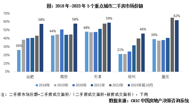 在重点监测城市中,有一类城市近两年二手房市场份额增长迅猛,2023年二手房成交规模持平甚至超过新房,它们是:合肥、南京、天津、重庆、郑州。