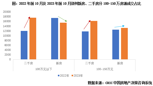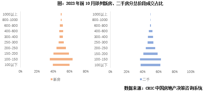 郑州新房、二手房市场具有相似的客群结构和成交结构,成交主力均为100-150万元产品,主要客群为价格敏感的刚需客,新房、二手房市场间产品需求互替、客群双向流动。郑州新房、二手房总价段成交结构分布形态近乎一致,成交占比最高的三个总价段分别是100-150万元、100万元以下、150-200万元。2023年前10月,郑州新房、二手房100-150万产品成交占比分别达到28%、26%。排在第二位的是100万元以下产品,新房成交占比达到20%,二手房成交占比达到25%。
