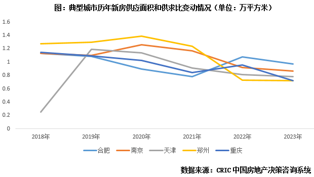 当前六城或多或少都面临供给约束:一方面整体供应缩量显著,供小于求持续加剧,限制成交放量。据CRIC监测数据,五城2020年之后整体新房供应规模便开始逐年下行,2022年基本都迎来阶段性低点,2023年如是,六城前10月供求比均小于1。