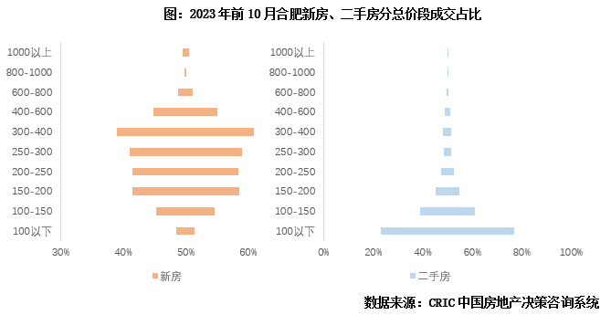 从成交结构心态来看,新房呈“纺锤型”分布,二手房呈“倒T型”分布。下图以合肥为例,2023年前10月新房成交主力总价段300-400万,占比22%,200-400万总价段成交占比过半。而二手房100万以下总价房源是成交绝对主力,占比高达54%,反观200万以上总价房源成交占比总计不足10%。