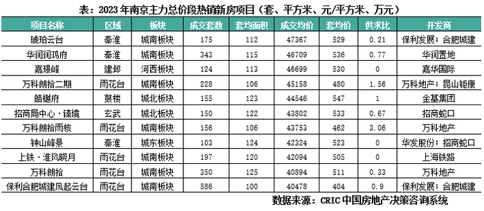聚焦主力成交总价段的热销项目,以南京为例,新房主要是主城区单价段4万元/平方米以上、面积110平左右的改善房源,区域分布上,秦淮、雨花台的项目相对较多,玄武、鼓楼、建邺也有部分项目入围,项目附近交通、商业、医疗、教育等配套齐全。套均面积集中在100-120平方米左右,三房设计居多。多为国央企或口碑民企开发,产品力及交付力相对有保障。