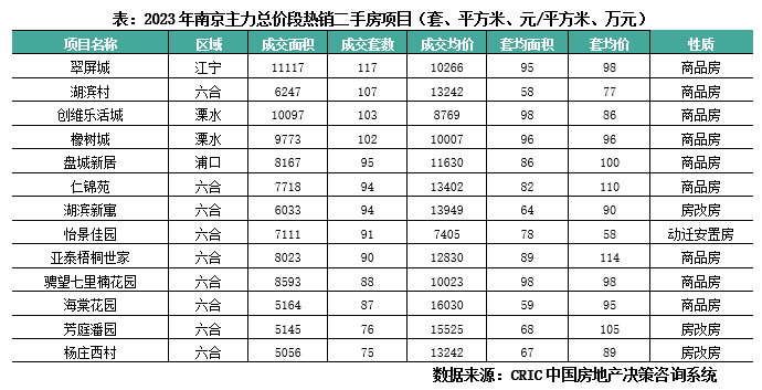 而反观二手房,主力成交总价段为150万元以下,成交套数排名靠前的项目主要分布在六合、江宁、浦口等区域,套均面积70-90平方米,房龄普遍在10年甚至20年以上,不少原为动迁安置房、房改房。