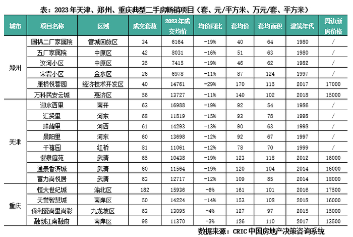 基于一二手房互替性特征,二手房持续分流新房客源,从近期成交套数排名靠前项目分布来看,郑州、天津、重庆畅销的二手房主要有两类:一类是交通便利低总价的主城老旧小区,降价吸纳了一波低购买力刚需客,以天津为例,水西里、汇贤里、珠峰里等典型畅销项目均位于主城六区,套均价在90万元左右,面积70平左右,房龄超过25年,但交通相对便利、配套相对齐全,再比如郑州的五厂家属院、国棉二厂家属院等小区,套均总价50万左右即可以在主城区置业;另一类价格明显低于周边新房的次新房,比如天津武清紫泉庭苑、通泰香滨城、静海春海园等项目,套均面积100平左右,价格几乎只有周边新房的6-7折,降价加上远郊限购放开释放了一部分刚性购房需求,再比如郑州康桥悦蓉园、万科民安云城等小区,房龄在5年内,价格比周边新房便宜每平米3000元左右,而且所见即所得没有交付风险。