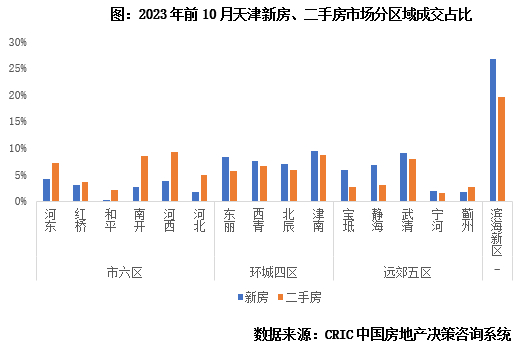又比如区域分布维度来看,以天津为例,环城四区、滨海新区、远郊五区的一二手房成交占比相近。东丽、西青、北辰、津南等4个环城区新房、二手房成交占比都在2成左右,滨海新区占比同样如此,静海、武清、宝坻等5个远郊区在一二手房市场份额在3成左右。市六区一二手房份额看似差异最大,市六区成交在新房市场占比仅有16%,而在二手房市场却达到37%,但细分来看,市六区的二手房成交中,7成的房源成交均价不到150万元,套均面积普遍较低,即通俗意义上的“老破小”,这类房源买家的购买力与近远郊新房置业者相近,客群间也存在重叠和流动,仅有占市六区成交不3成、占二手房总成交约11%的比例的房源为高总价的次新改善,这与15%左右核心区新房改善需求比例也非常接近。