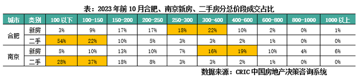 合肥、南京新房、二手房成交结构迥异,新房主要面向改善客群,二手房全面承接刚需。合肥新房主力成交总价段300-400万,二手房100万以下占比过半,南京一二手房客群购买力高低分明,新房300-600万、二手150万以下占比最大。