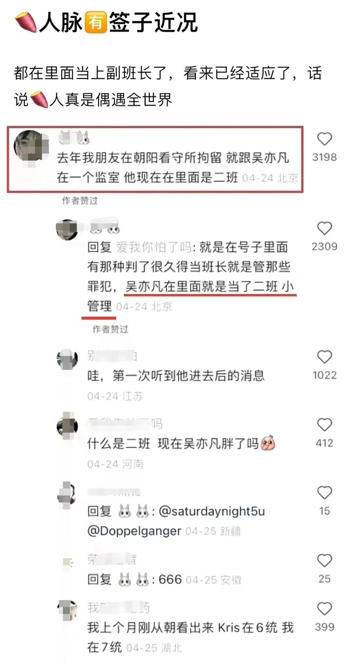 因为更早些的时候,还有网友爆料,去年在看守所探监的时候,发现吴亦凡在里面已经当上二班(副班长)了,主要工作职责就是督促同室的舍友保持好内务卫生。