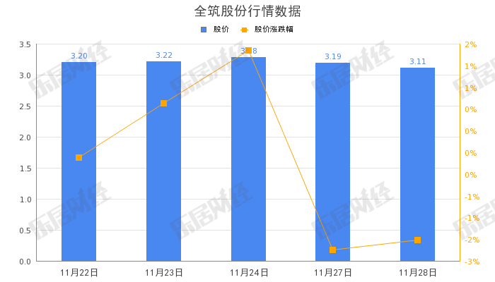 截至11月28日,全筑股份(603030.SH)股价收盘报3.19元,跌2.51%,总市值19.75亿元。