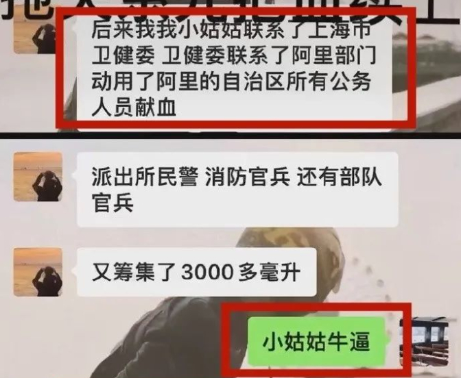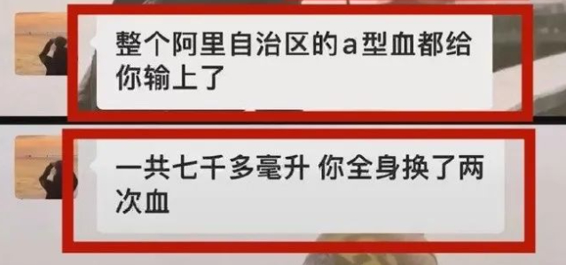 血槽姐和老公对话中说,这次一共用了7000ml血,整个阿里自治区的a型血都给你输上了。