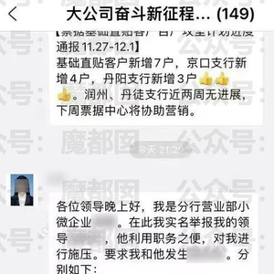 12月4日,网传一名银行女员工在上百人的内部工作群中,实名举报她的直接男领导,利用职权对自己施压,3次强迫自己与他进行二人“特殊物理碰撞运动”。