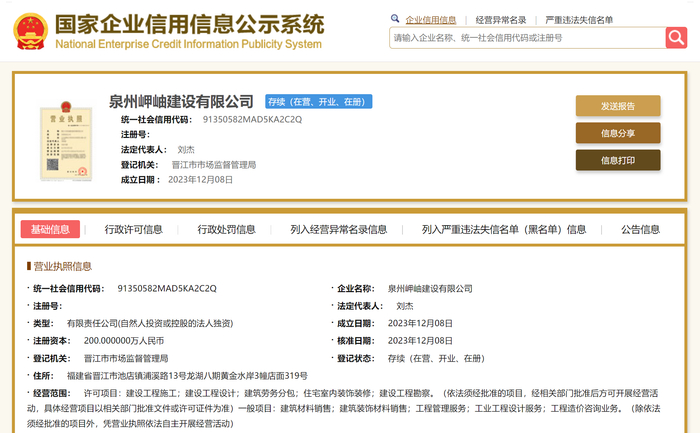 泉州岬岫建设有限公司成立于2023年12月8日,注册资本200万元,法定代表人为刘杰,经营范围包括建设工程施工;建设工程设计;建筑劳务分包;住宅室内装饰装修;建设工程勘察等。
