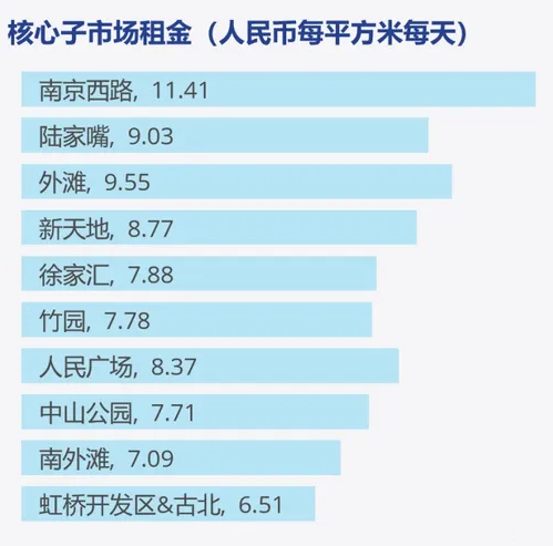 核心区,租金最高的是静安区的南京西路板块,第三季度平均租金达到11.41元/平方米/天。不过,这个价格较上一季度,还是降了0.86元。