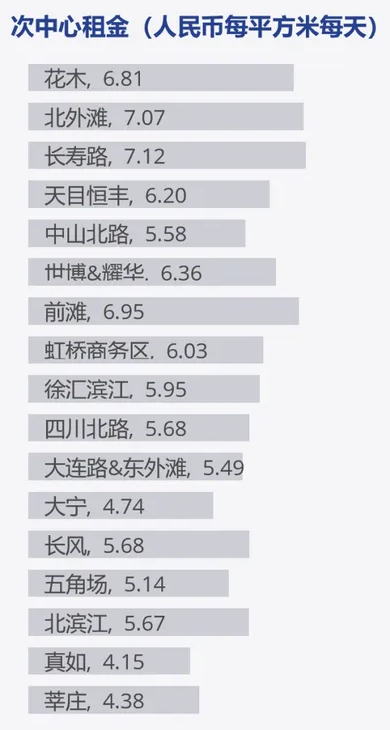 次中心区域,三季度租金水平前三位分别是长寿路7.12、北外滩7.07、前滩6.95,租金靠后的为真如4.15、大宁4.74、莘庄4.38。