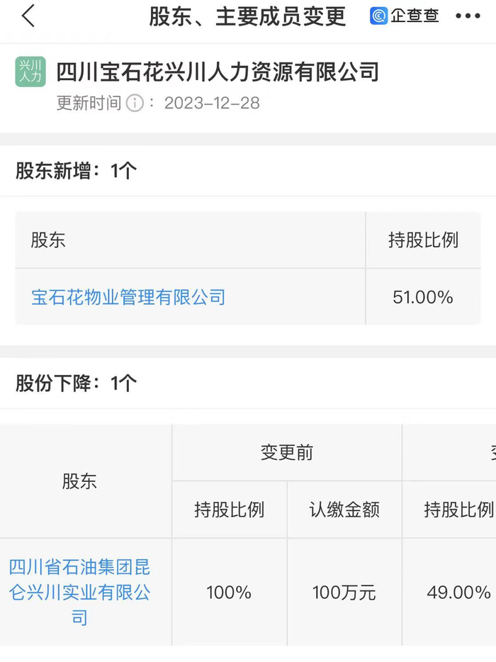 乐居财经 吴文婷 12月29日,四川省石油集团昆仑兴川实业有限公司(以下简称“昆仑兴川实业”)转让四川宝石花兴川人力资源有限公司(以下简称“宝石花兴川人力资源”)51%股权,宝石花物业管理有限公司(以下简称“宝石花物业”)接盘。