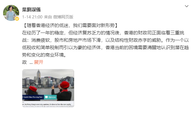 香港行政会议召集人、新民党立法会议员叶刘淑仪于1月14日在微博上表示,股市作为经济状况的重要指标,持续的港股下跌可能会影响对香港作为全球顶级金融中心地位的信心。她指出,低估值已经抑制了在香港上市的兴趣,进而影响到与上市和并购相关的专业和商业服务需求。