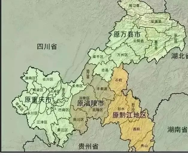 上面是直辖之前的“老重庆市”和周边省、市地域图。(直辖后,重庆吞并了原属于四川的涪陵市、万县市和黔江地区。)