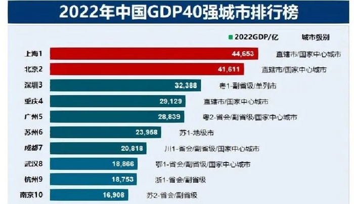 上图是2022年全国主要城市GDP总量和排名。(2023年很多城市还没有公布,所以我们以2022年为依据)。