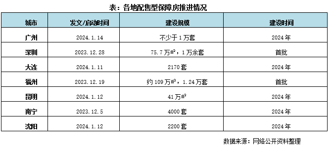 随着顶层设计的不断落地,各地也在积极规划配售型保障房的建设目标,并跟进配套举措。以广州为例,虽然2023年广州销售型保障房规模处于低位,占住宅销售面积的比重仅有3%。但其2024年销售型保障房规模大增,年内将筹建不小于1万套,并且首批销售型保障房已经开工。除广州外,南宁、福州、深圳等城市均提出了2024年年度或者首批配售型保障房的计划建设量,深圳计划1万余套,福州首批约1.24万套、南宁约4000套、沈阳2200套,积极推动配售型保障房落地,积极解决中低收入人群和引进人才住房困难问题。