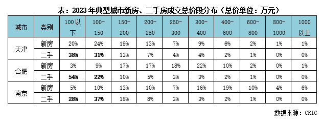 具体城市方面,近年来天津、合肥、南京大量刚性需求转向二手房市场,导致二手房中低总价段房源成交占比高企,尤其是合肥二手房交易结构中,100万元以下房源占比达到54%,而在新房交易中,仅有3%的为100万以下。未来随着配售型保障性住房的发展,得益于更低的价格门槛,这些城市的二手房市场中的刚需份额有望重新向新房市场回归。