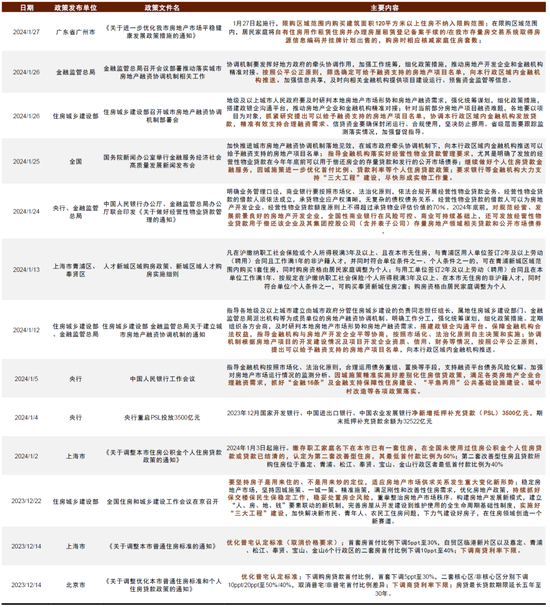 近期房地产政策的出台呈现出多角度、多部门、更灵活、更积极的态势。自2023年12月起,全国及一线城市的房地产政策频率和力度呈现明显抬升态势,可大体分为三个条线:其一,自上而下更加积极的处理供给端信用问题及衍生风险,包括住建部和金融监管总局牵头建立城市层面房地产融资协调机制[1],央行和金融监管总局发布金融支持租赁市场发展[2]、做好经营性物业贷管理[3]的通知;其二,自上而下“充分赋予城市房地产调控自主权”[4],随后广州[5]对限购做明显调整(即较大户型取消限购,其他类型住房用于租赁或出售的不计入限购套数认定),此前在12月一线城市已在限购、限贷方面做过一些积极调整;其三,在“三大工程”建设方面推进融资支持和具体实践,包括12月PSL余额净增3500亿元,媒体报道的城中村改造、保障房建设的城市范围扩容[6],广州发布《城中村改造专项规划》[7],深圳发布《关于积极稳步推进城中村改造实现高质量发展的实施意见》[8]等。1月25日在国新办金融服务经济社会高质量发展新闻发布会上,金融监管总局明确表态“房地产…对国民经济具有重要影响…金融业责无旁贷,必须大力支持”,房地产政策开始出现更积极的转变。