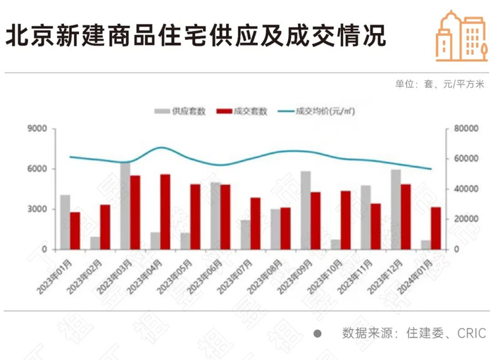 从北京市场情况来看,CRIC数据显示,新房市场迎来春节前的周期性回落,2024年1月北京新房市场供求量环比下跌,北京新建商品住宅(含普通住宅、别墅,不包括共有产权房)1月新增供应688套,环比下跌88.5%,同比下跌83.1%;成交3142套,环比下跌35.5%,同比上涨12.9%;成交均价53332元/㎡,环比下跌5.1%,同比下跌12.9%。