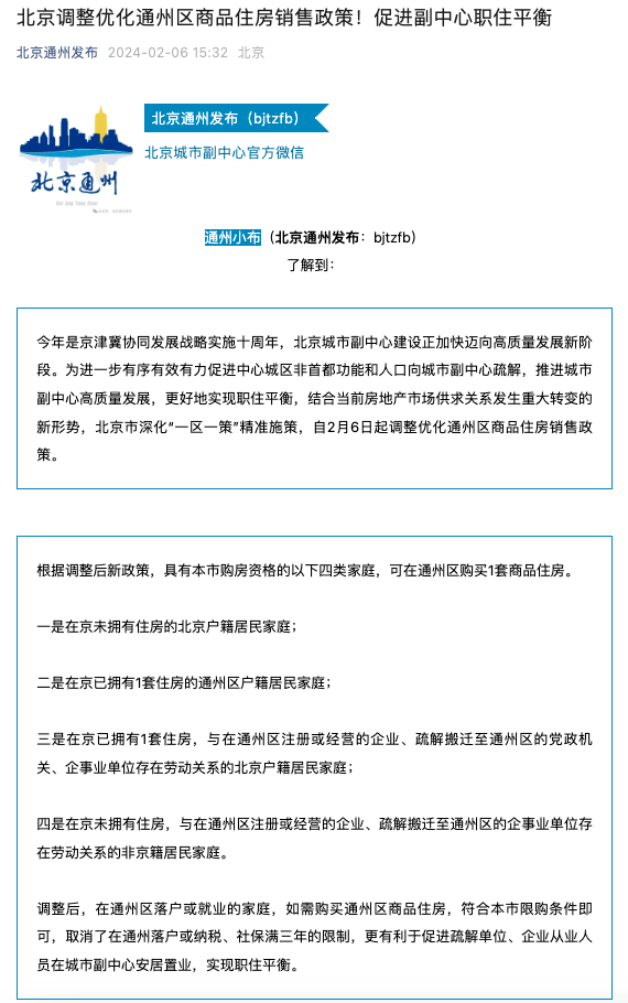 2024年2月6日,北京调整优化通州区商品住房销售政策。