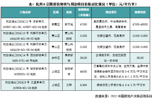 例如拱墅区新天地地块销售限价47000元/平方米(含装修),周边棠前嘉悦府等项目的销售均价显示也在47000-48000元/平方米范围内,萧山科技城两宗地块、余杭区高铁新城地块销售限价也都表现为与周边项目售价持平;