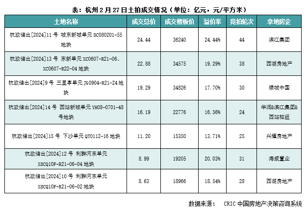 2月27日,杭州进行了2024年挂牌地块的首批集中出让,本次杭州诚意满满地拿出了7宗优质宅地,土拍高热的结果也在意料之中。7宗地块的成交总金额为111.6亿元,整体溢价率达到19.1%,其中有6宗地块溢价率超过此前“限地价”15%的上限。
