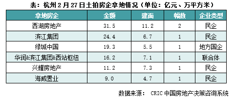 总体来看,杭州年后的首次土拍热度较高:7宗地块均高溢价成交,整体溢价率达到19.1%,而民企依然是杭州土地市场的中坚力量,民企包揽5宗地块且拿地金额占总金额的68%。