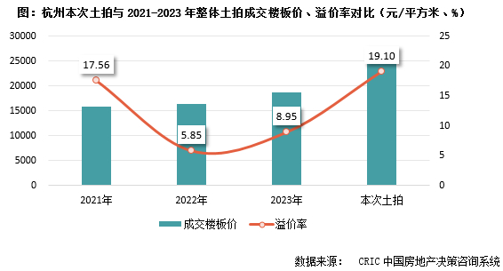 与前几年杭州整体溢价率和楼板价对比来看,本次杭州土拍的溢价率水平高于2021年平均溢价率1.5个百分点,更是分别高出2022年和2023年的平均溢价率13个百分点和10个百分点。
