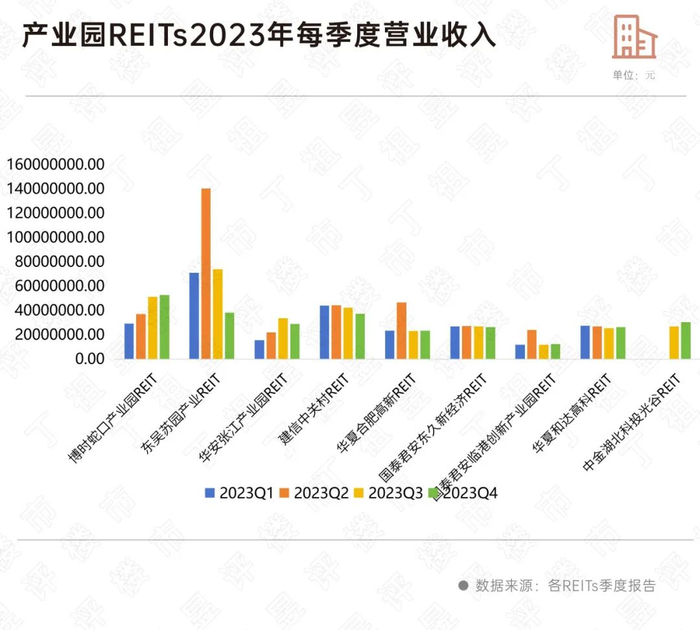 营收方面,产业园区REITs全年存在一定波动。东吴苏园产业REIT与华夏合肥高新REIT较为特殊,第二季度营业收入到达波峰。从四季度对比来看,上半年增幅较为明显,下半年营业收入显著下降。