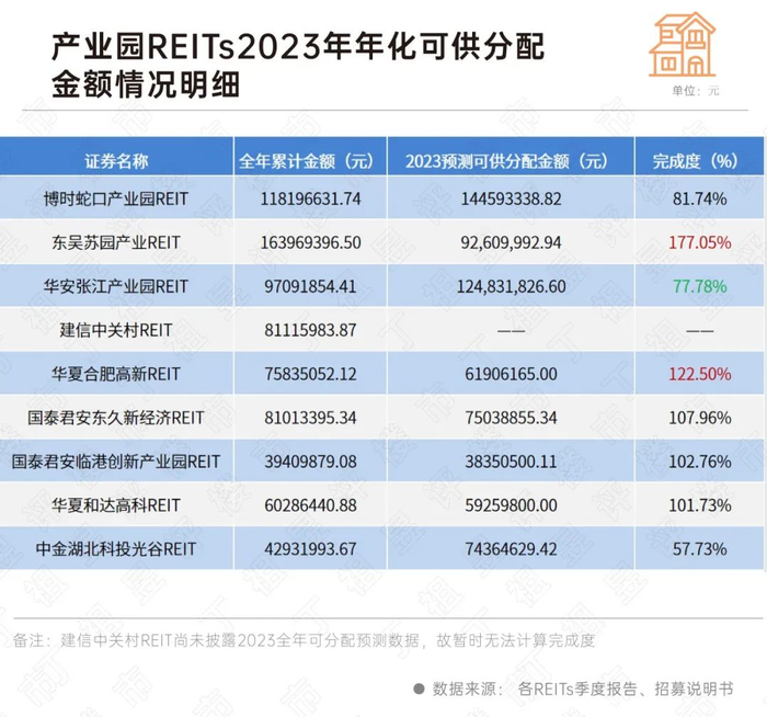 从可供分配金额完成度看,与REITs经营业绩类似,存在两极分化。整体上各REITs表现较好。其中,东吴苏园产业REIT、华夏合肥高新REIT表现突出,超预期完成分红。