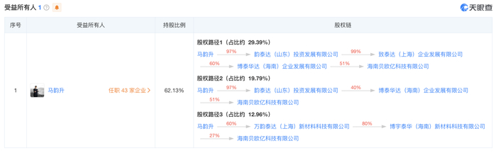 据查阅,贝欧亿成立于2023-07-04,法定代表人为赵永臣,注册资本为11000万元,经营范围包含:新材料技术推广服务;新材料技术研发;塑料制品制造等。经股权穿透,马韵升为受益所有人,持股比例为62.13%。