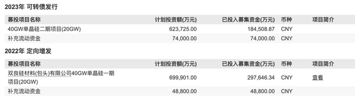 2022年8月和2023年8月,双良节能分别通过定增和发行可转债募集资金34.88亿元、26亿元用于40GW单晶硅项目建设,扣除用于补流部分,已经投入48.21亿元。