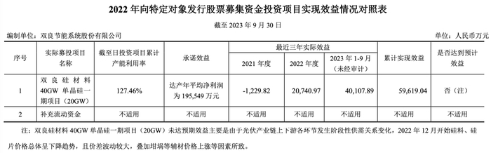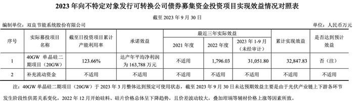 2023年8月发行可转债募投的40GW单晶硅二期项目在2023年3月整体达到预定可使用状态,2022年和2023年前9个月,分别产生效益1796.03万元、3.11亿元,累计实现效益3.28亿元,产能利用率123.66%。