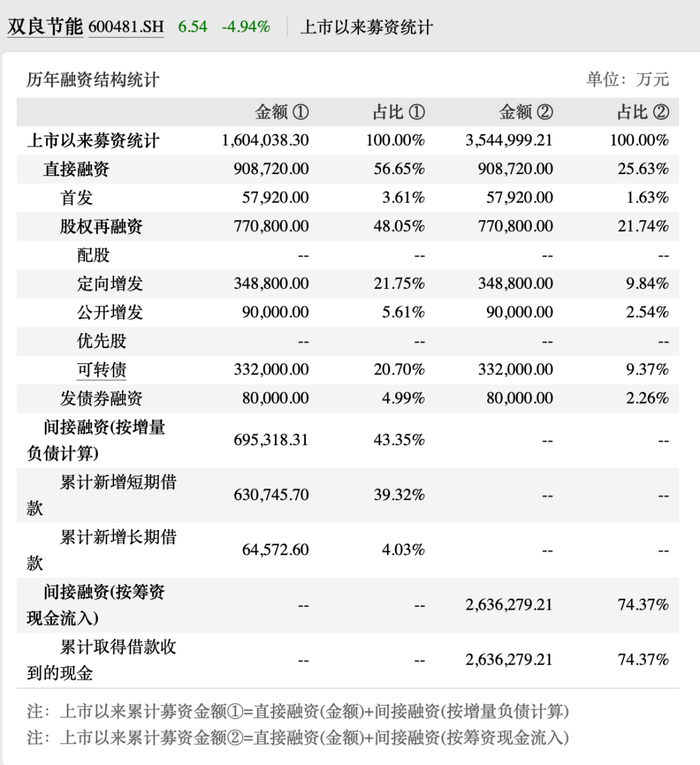 万得数据显示,2003年上市以来,双良节能累计募资(按筹资现金流入)354.50亿元。包括IPO募资5.54亿元;两次定增募资43.88亿元,发行双良转债(110095.SH)26亿元,但项目仍需较大资金投入,未来面临较大的资本支出压力。