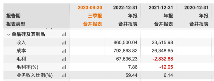 2021年和2022年双良节能分别实现营业收入38.30亿元、144.76亿元,同比增长84.87%、277.99%;对应净利润3.1亿元、9.56亿元,同比增长125.68%、208.27%。其中,单晶硅业务在2021年实现营收2.35亿元,占总营收比6.14%,到2022年硅片业务营收增长至86.05亿元,占总营收比重提升至59.44%。