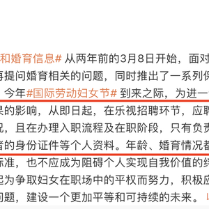3月7日,乐视视频官方账号发文称,即日起,在乐视招聘环节,应聘者简历中无需填写年龄、婚育等情况,且在办理入职流程及在职阶段,只有负责员工档案管理的人员有权查看应聘者的身份证件等个人资料。随后,“乐视面试简历无需填写年龄和婚育信息”话题冲上热搜,引发广泛关注和讨论。