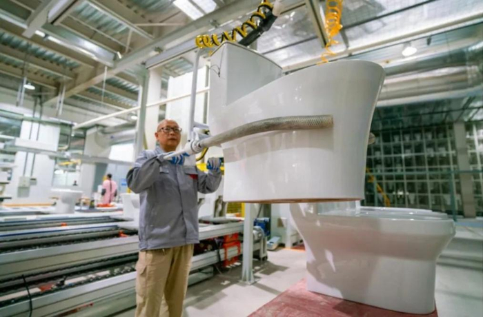 惠达卫浴位于重庆的5G+数智化工厂,就是其探索实践的成果结晶。王佳介绍,这条惠达卫浴自主设计的智能化卫生陶瓷生产线按国际工业4.0标准打造,关键生产工序数控化率达到100%,年产能比相同占地面积产能提升30%,创造了行业自动化、智能化陶瓷产品生产线新标杆。