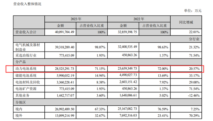 分产品来看,公司主营产品为动力电池系统、储能电池系统、电池材料及回收、电池矿产资源以及其他业务,分别实现营收2852.53亿元、599.01亿元、336.02亿元、77.34亿元、144.27亿元。其中,动力电池系统营收占比71.15%。