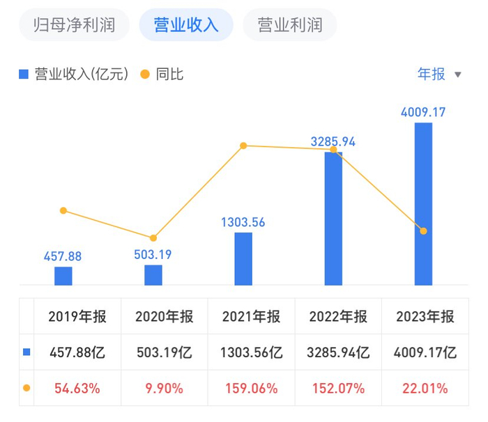 其中,在营收方面,宁德时代已连续多年上涨。数据显示,2019-2022年,其营收分别为457.88亿元、503.19亿元、1303.56亿元、3285.94亿元,同比分别为54.63%、9.90%、159.06%、152.07%。也就是说,从2019年至2023年的五年时间里,宁德时代营收翻了8.75倍。