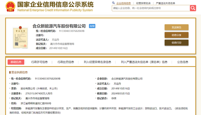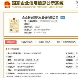 国家企业信用信息公示系统显示,近日,哪吒汽车关联公司合众新能源汽车股份有限公司(以下简称“合众新能源”)发生工商变更,注册资本由26.6亿人民币增至27.6亿人民币,增幅约3.76%。