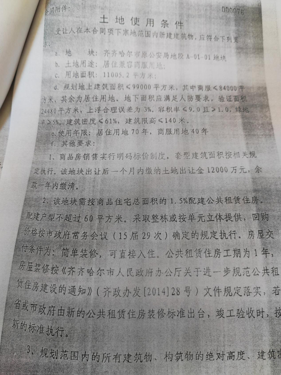 “实际上,我们公司早在2018年鑫茂大厦封顶后就向建华区房屋征收与补偿办公室(以下简称‘征收办’)申请了回迁安置工作。此后,我们又陆续多次向齐齐哈尔市委、市政府,建华区政府递交了报告,希望可以尽快解决回迁安置工作,结算房屋回购款及产生的陈欠物业费和取暖费。齐齐哈尔市人民政府也多次开会研究过,建华区人民政府曾回复我们说2023年6月份解决回迁问题,但一拖再拖,一直到今天还没解决。”大地公司经理李欣桐接受记者采访时介绍,产生诸多矛盾的根源来自最初土地的“带病”出让。