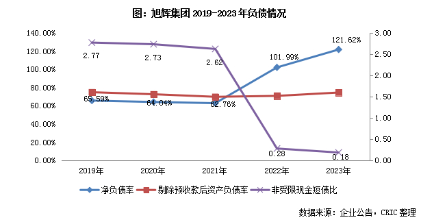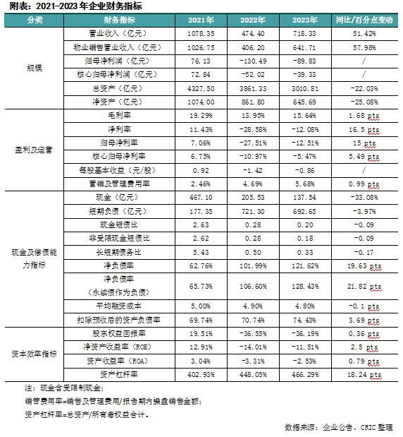 2023年底旭辉的持有现金约为137.54亿元,较于期初减少了33.08%;总有息负债为922.81亿元,较于期初减少14.91%;总权益为645.69亿元,较于期初减少25.08%。因此企业的净负债率提升了19.63个百分点至121.62%;若是将永续债作为负债计算,则旭辉的净负债率为128.43%,较于期初提升了21.82个百分点。